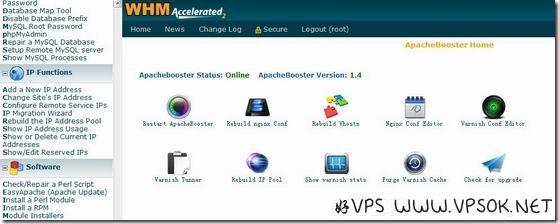 ApacheBooster是WHM的一款免费的加速插件,他使用nginx做一级加速,用varnish做二级加速,实际使用中效果也不错,nginx的负载能力优于apache。