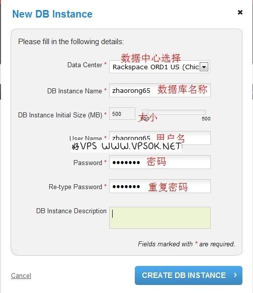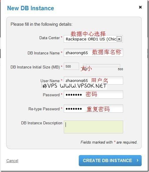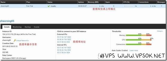 完成之后,点击右下角的CREATE DB INSTANCE创建数据库。这里大家要注意,这个创建的过程,不是瞬间完成的,你主机看进度那里有个百分比的,大约30秒左右吧,就能看到你的数据库外链,内链地址,CPU,内存,在线时间等信息。