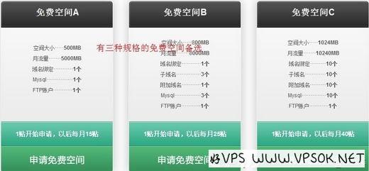 这个麒麟主机,估计是准备做IDC的(我也是根据网站名称猜测的),不过目前没有看到该站点有任何收费产品,只有提供免费主机页面。麒麟主机提供三种不同规格的免费空间,需要靠论坛发帖申请和维持空间的使用,三种空间申请都仅需发一个帖子,但维持空间A,B,C各需要发15帖,25帖,40帖。三种规格的空间参数如图: