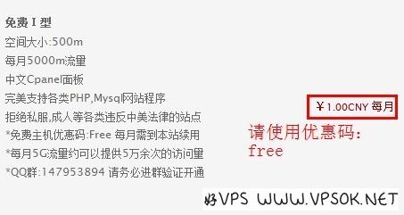 图中你看到1元每月,使用优惠码:FREE就是免费的了。另外,为了保证你对空间的有效使用,需要每月到网站续费,不过,也是免费的。