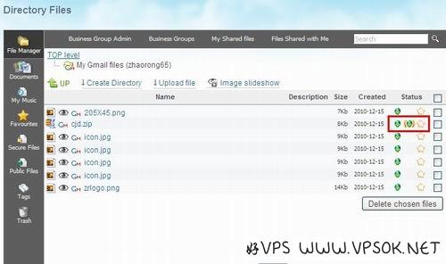 点击Lite File Manager之后,我们就能看到我们的gmail邮箱,后边还有我们的用户名的那个就对了,点进去。这里我不需要多解释了吧?上面中间有Upload file,就是上传文件,我们点击,上传我们需要外链的文件,这时候,怎么样才能外链呢?好的,我来说下设置这个文件的外链的过程,比如我上传了一个CJD.zip的文件上去,这个文件,我们可以在Lite File Manager—Gmail邮箱,选择之后就能看到了,看到这个文件之后,我们就点击这个文件,再出来的菜单上选择:Make public,之后我们可以看到这个文件的末尾多了一个图标,这就说明设置外链成功了,如图: