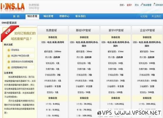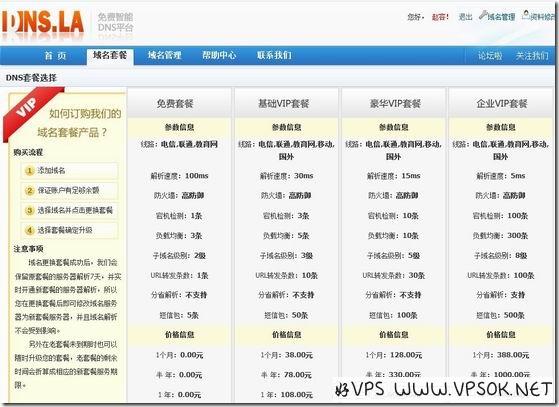 下面是DNS.LA提供的解析服务套餐,我们最关注的当然是免费套餐了,嘿嘿。