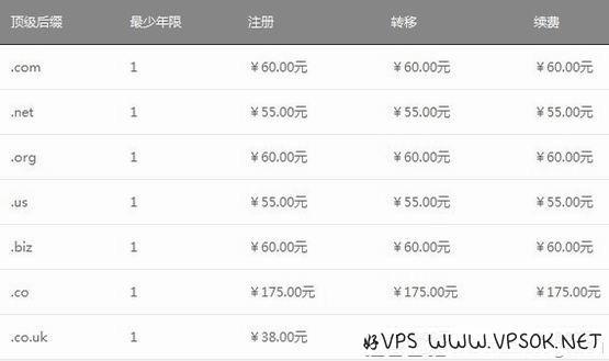 目前,VPSAA提供的域名后缀包括.com、.net、.org、.us、.biz、.co、.co.uk等常见域名后缀,所有域名注册,转移,续费同价,免费DNS解析管理,免费的Email转发,免费在线获取转移码自由转出,免费的Whois隐私保护!