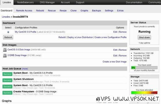 dashboard:这是一个总览,我们能看到VPS的信息,上面是系统,SWAP大小,接下来是系统启动记录,在下面Graphs是资源的使用情况表。而在该界面右侧边,是VPS的运行情况,网络使用情况,磁盘情况等。