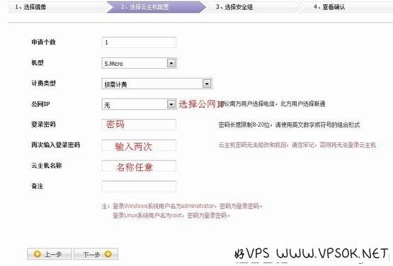 选定之后,点击开始申请,来到下面的界面。选择云主机的配置,包括申请个数,机型,计费类型,公网IP选择,登陆密码(如果linux系统这个密码就是root密码,windows系统则为administrator密码)