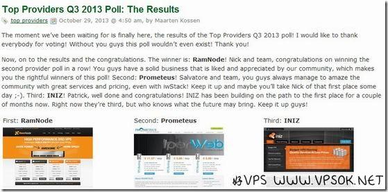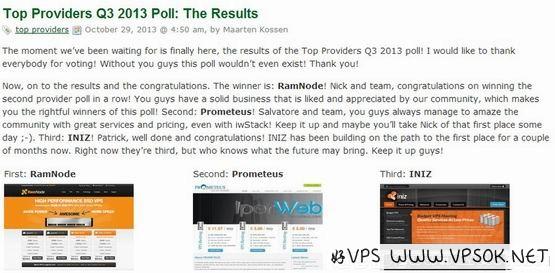 这是一份转述性文字,源内容来自LEB,敬请留意。每个季度LEB都会做一个投票,由读者评选自己心目中觉得最好的VPS主机商,目前,2013年第三季度的评选结果正式揭晓了,荣获本季度读者评选前三名的IDC分别为(根据排名排列):RamNode、Prometeus、INIZ。