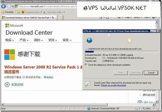 首先,下载windows2008中文语言包,直接在微软官方下载即可,因为我这个VPS装的是Windows2008R2 SP1 64bit,所以:下载链接。大家如果是不同版本的,请注意选择对应的中文语言包。