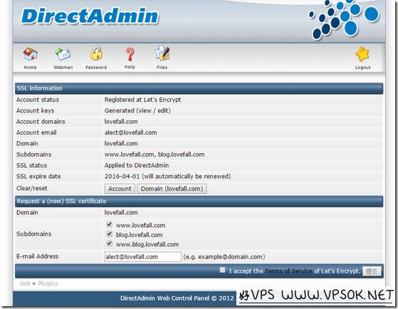 管理员登录后台,首页最后有个Let’s Encrypt Certificates ( 类似这个地方 https://abc.com:2222/CMD_PLUGINS_ADMIN/da-letsencrypt/index.html)