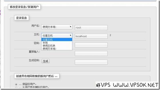 也可以登陆到phpmyadmin,点击头部“权限”,选择root localhost,编辑权限,登陆信息,主机,选择“任意主机”(默认为本地)