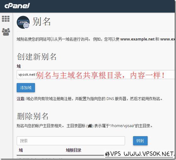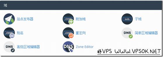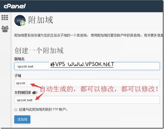 我们应该首先对域有个基本的认识,我们一般称为域名,所以后面我会写作域名。有一些朋友甚至对子域名也不肯定,什么是子域名?打个比方,vpsok.net是个域名,而blog.vpsok.net就是个子域名,他的子域名前缀就是blog。而在cPanel面板(下简称为CP面板)中,@和www域名不用重复绑定,我们订购时使用的域名也已经默认绑定为主域名。这些话看起来很绕口,实际非常简单,还是已例子来说明,比如,我订购主机的时候,填写了vpsok.net这个域名,那么主机开通后,默认就已经绑定了vpsok.net,该域名叫做主域名,我们不需要添加www.vpsok.net这个域名,原因前面说了,www域名默认绑定了不需要重复绑定,这在之后的附加域或者别名时也是一样,不用重复绑定www,也不要添加www前缀为子域名。