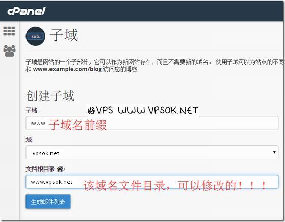 接下来我们再看看子域,关于什么是子域名我在文章开头特别说了,本文所使用的主机主域名是vpsaa.com,这里添加一个前缀为clients的子域名,我们在该功能页面子域框里输入前缀,域中可选择域名,如果我们主机中有附加域这里是可选的,文档根目录下面截图一样是自动生成的,也可以修改,可以修改!!!至于该子域名的文件放哪里,同上,文档根目录就是给你放网站文件的!