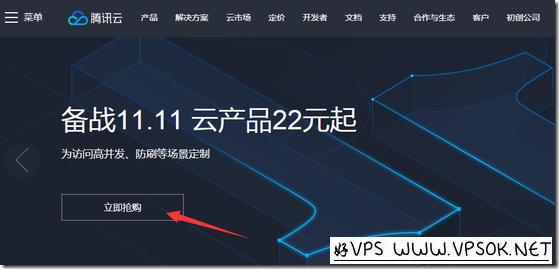 上图我专门画了个箭头,访问腾讯云官网(点击直达官网),网站上面的幻灯广告第一个就是双十一活动链接,可以点立即抢购直达双十一优惠页面。