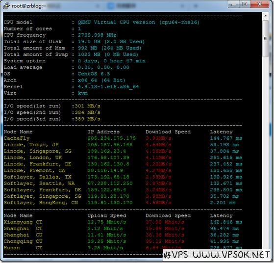 以上优惠码适用于全部机房套餐,终身折扣,续费同价,大埔机房国内访问也是CN2线路,机器均提供较大端口带宽,宿主机采用双E5-2680 V2 CPU,SSD硬盘组RAID5阵列,手上开了一款最低配置1G套餐,来个测试命令截图:
