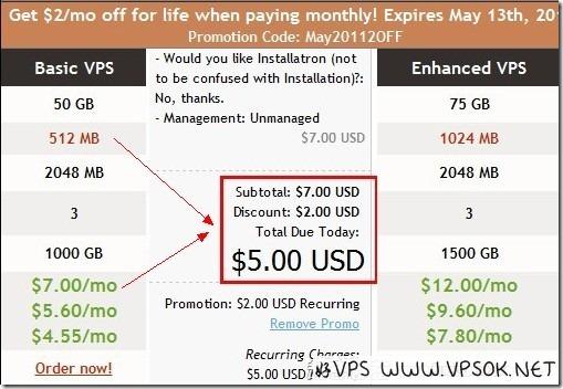【2011.5.9更新】目前,VIPRPUS推出了他们的最新优惠措施,就是月付用户使用优惠码,可以月省$2,原价月付$7的Basic VPS现在仅需$5,相当超值。下面是官网原文: