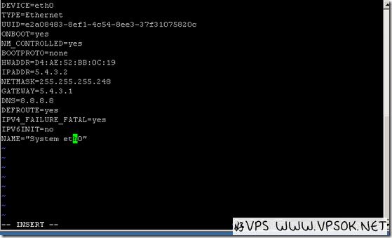 DEVICE=eth0 TYPE=Ethernet UUID=f4c750d5-86f5-4a21-903a-435e25685bea ONBOOT=yes NM_CONTROLLED=yes BOOTPROTO=none HWADDR=D4:AE:52:BB:A4:C9 IPADDR=5.4.3.2 PREFIX=29 GATEWAY=5.4.3.1 DNS=8.8.8.8 DEFROUTE=yes IPV4_FAILURE_FATAL=yes IPV6INIT=no NAME="System eth0"