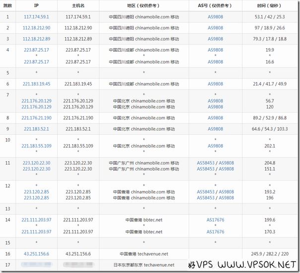 13 117.172.50.46 99.62 ms AS9808 {"as":"AS9808","area":"中国\t四川\t成都\t\t移动\t30.658529\t104.075546"}