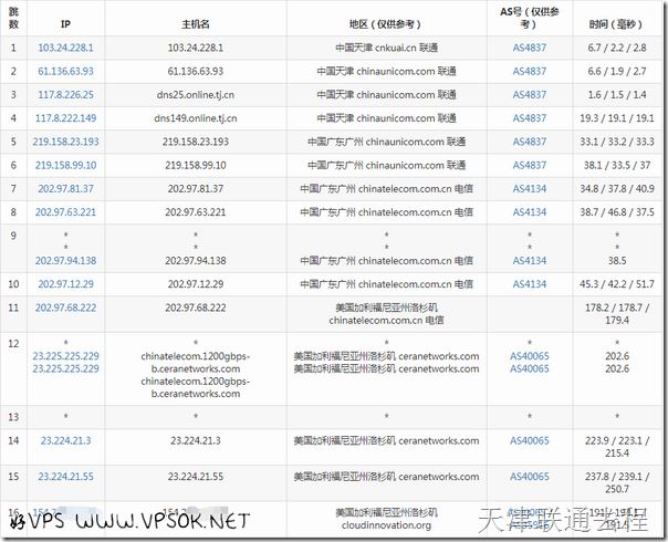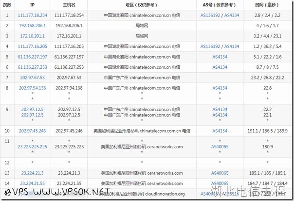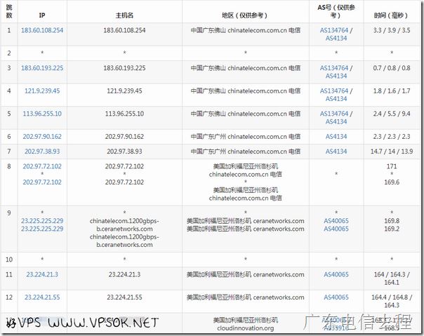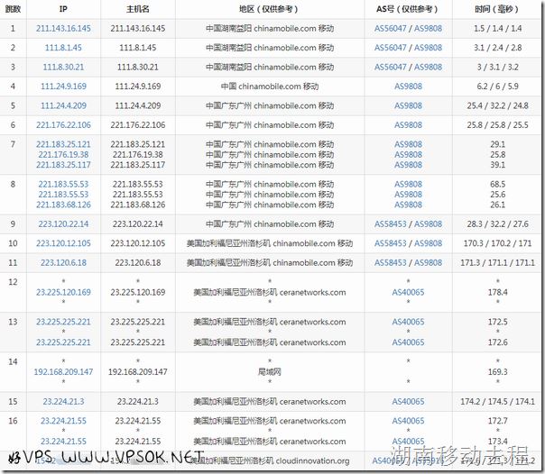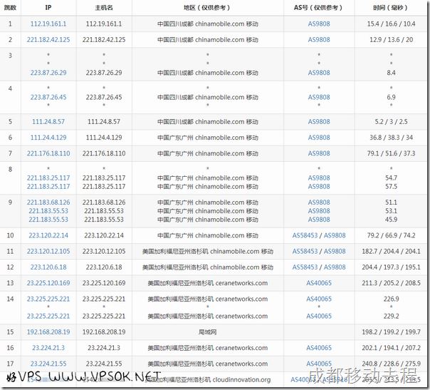 去程路由我在不同的运营商不同的地区进行了多次的测试,就不全部贴上来了,三网自有线路去程,总体上是电信走AS4134去程,联通走AS4837去程,移动走AS9808去程。