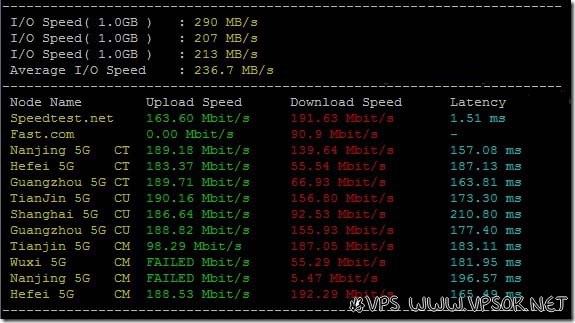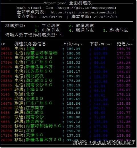 使用了2个一键包分别测试,下面是第一张,SuperSpeed全面测试脚本,线路带宽充裕,是200Mbps带宽。